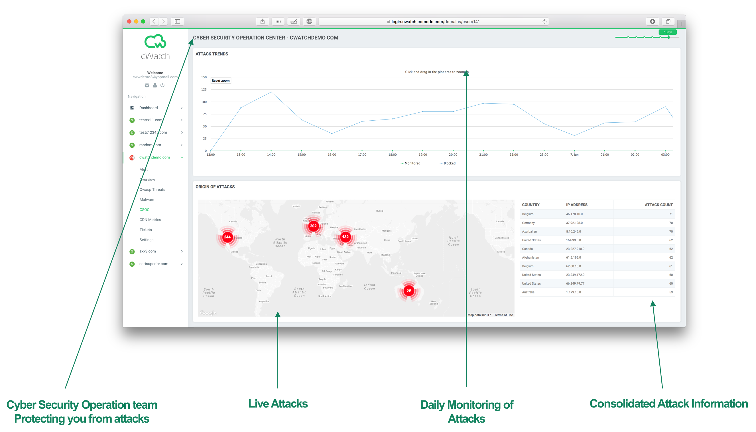 Comodo cWatch CSOC extends your internal IT team's capacity to protect your applications with advanced security solutions that are easy to implement, fully managed and do not require large upfront investments. It is designed to absorb the time-consuming and complex security incident investigation process, while offloading the high costs of an in-house security staff.