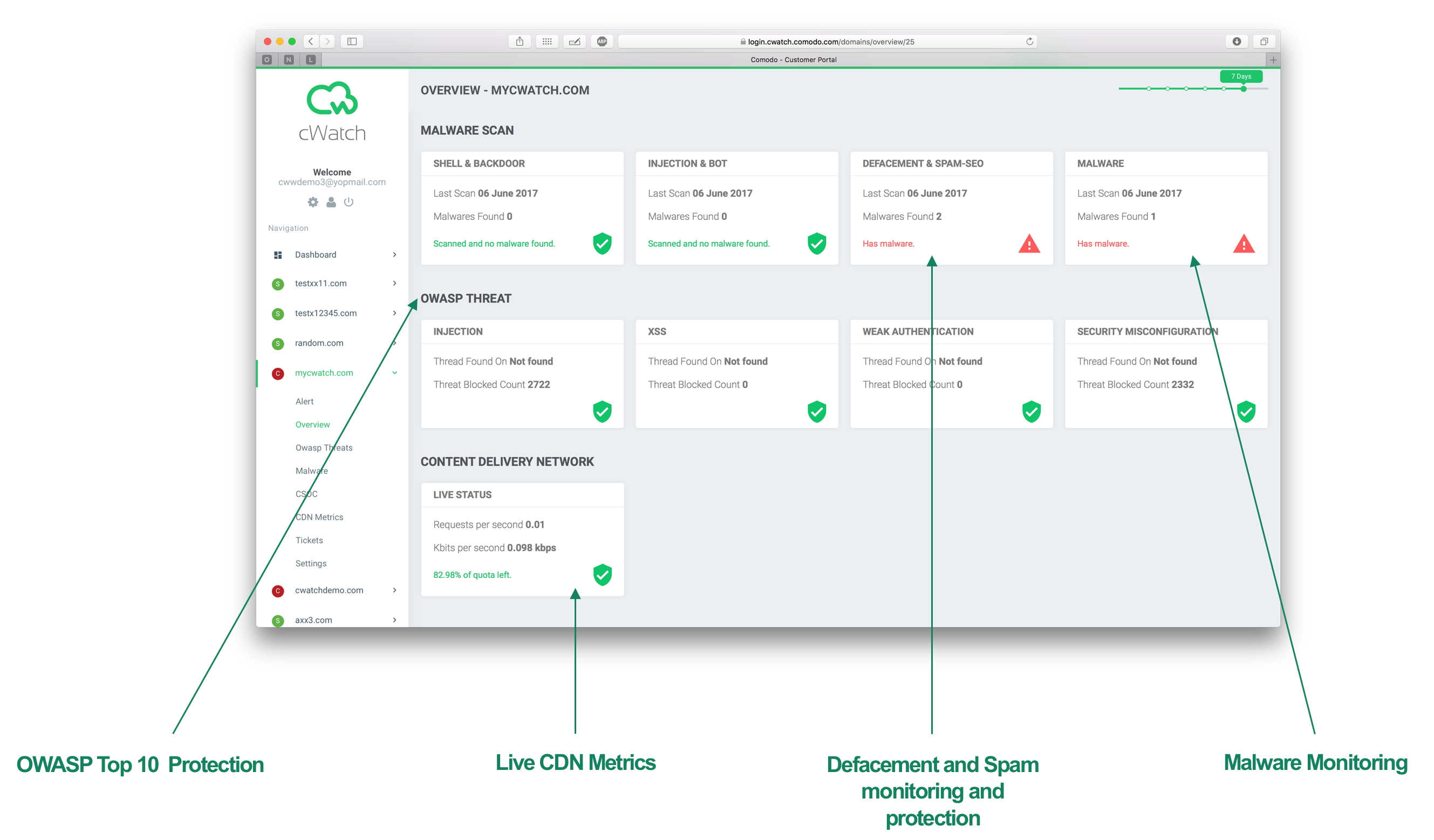 cWatch Web software runs on Comodo's high capacity cloud – the Content Delivery Network (CDN) to host the protection / detection software at geographically placed servers around the globe. There are many security delivery advantages to this architecture - ease of deployment and agility in its upkeep to an ever-changing threat – and some that come by default, such as DDoS mitigation and greatly accelerating your website traffic.