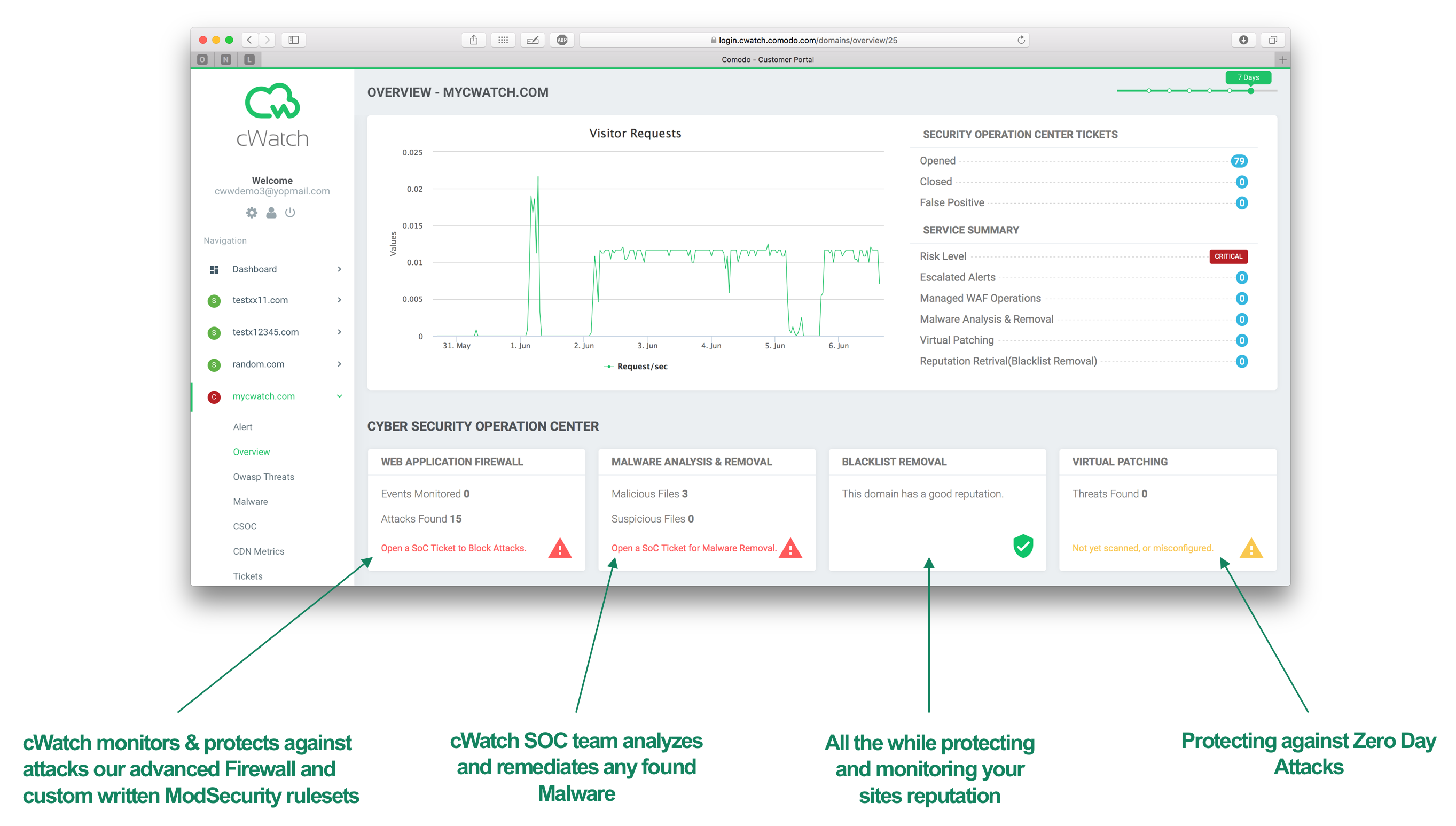 SIEMs are expensive tools with equally expensive integration consulting costs to get the tool into operation with the right logs – tuned to a client's specific environment. And they suffer other issues like agility – able to change with the rate and sophistication of modern day threats. Comodo's cWatch SIEM is owned by Comodo and the client user interface is free – bundled with the service in the SaaS model. There is no training required as it is entirely designed for an intuitive ease of use. Set up is instantaneous - no additional cost. At operation, it has the SIEM-typical reporting features of other competitors but the simplicity for ease of use is a key feature: simple information and event management to tackle real-time security monitoring, advanced threat detection, forensics and incident management. With an analytics-driven SIEM, Fully Managed WAF and Comodo's industry leading Cyber Security Operation Center (CSOC) in the background. cWatch Web builds the awareness that is essential to understand the cyber-state-of-protection of your web presence.